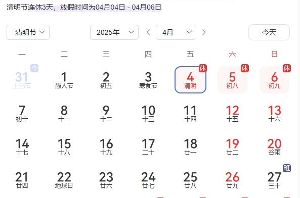根據國家2025年春節(jié)放假通知并結合本司實際情況,放假做以下調整:1、放假時間:2025年4月4日至2025年4月6號,共3天,3月7號正常上···